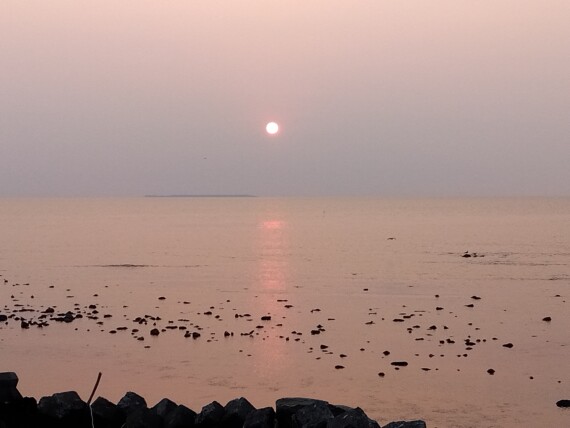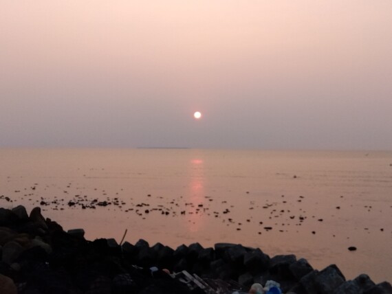 春の夕日はどこか霞んでいて、それでも柔らかな情緒がありますね。沖の方に薄っすら、飛島わかるかな?